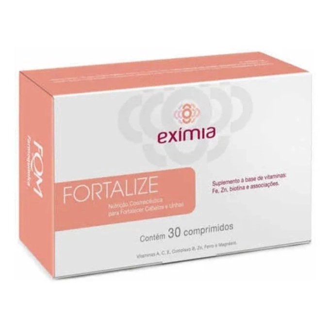 Eximia fortalize 30 comprimidos – Exímia Possui uma fórmula especial que contém Zinco, Biotina, Ferro, Vitaminas a, c, E e Complexo b, além do Ácido Fólico e do Magnésio. O produto apresenta concentração até quatro vezes maior de Vitamina C e até dez vezes maior de Vitamina e, além de conter a maior concentração de Biotina do mercado. Sugestão de uso: Utilize 1 comprimido ao dia ou conforme recomendação médica. Contraindicações: Hipersensibilidade (alergia) à algum dos componentes da fórmula. Precauções: Gestantes, nutrizes e crianças, somente devem consumir este produto sob orientação de nutricionista ou médico. Consumir este produto conforme a recomendação de ingestão diária constante na embalagem